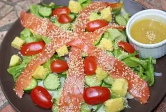 Smoked salmon, avocado, lattuce, rocket, cherry tomatoes, onion, cucumber, sesame - with honey mustard dressing.
