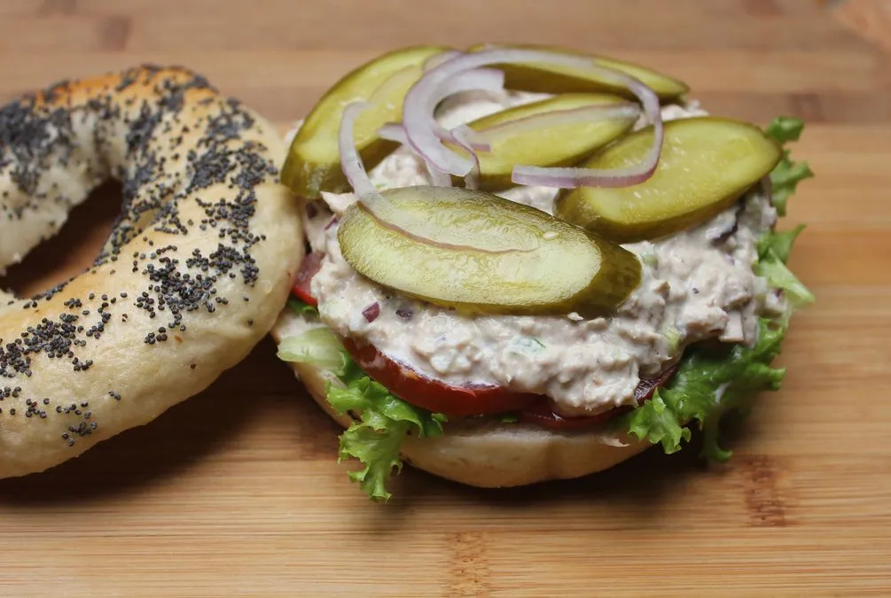 Tuna, Celery, Onions, Dill Pickles, Tomato, Lettuce, Mayonnaise, Dijon Mustard, Garlic And Lemon.